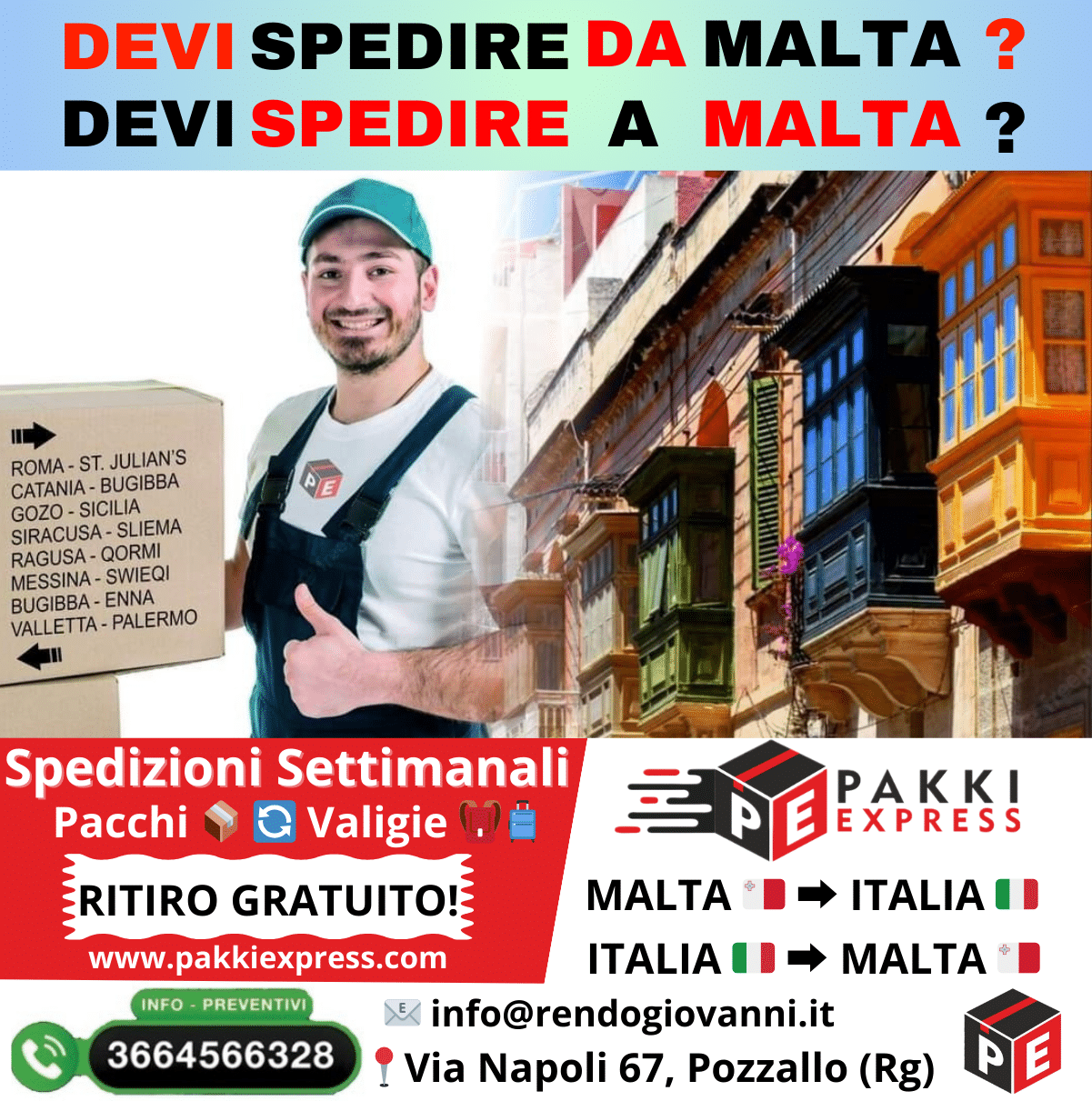 Hai bisogno di spedire un pacco o una valigia da Malta all’Italia o dall’Italia verso Malta in modo veloce, sicuro ed economico? Con Pakkiexpress.com puoi farlo in pochi click, risparmiando tempo e denaro grazie a...